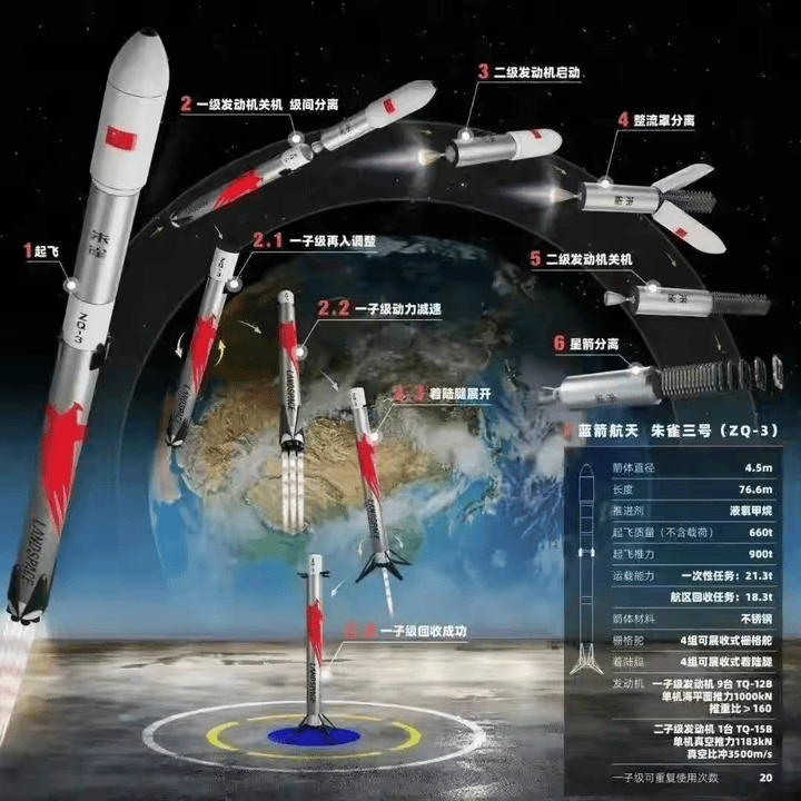 不过必须指出的是,截至2025年11月,猎鹰9号火箭的单枚助推器复用次数已达到30次,这是目前公开的最高纪录。而理论上讲,液氧甲烷发动机的复用次数是要高于液氧煤油发动机的,所以朱雀三号的助推器在技术成熟之后,可复用次数也至少在30次以上。