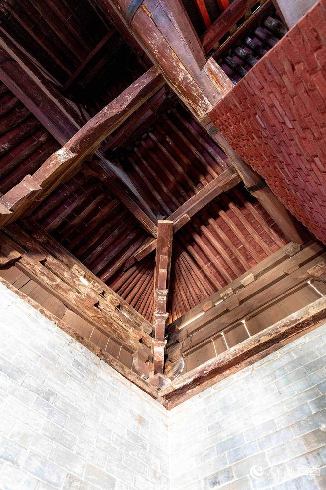 拾级而上,山门之上的倒座戏楼豁然开朗。这个曾用油灯与火把照明的舞台,其存在本身就是建筑智慧的结晶。尤为罕见的是山墙顶部的五叠式马头墙,这种源自徽派建筑的设计,不仅阻隔了明火隐患,更将戏台与两侧妆楼的木构彻底隔离,见证了明清时期晋东南与赣皖地区的美学碰撞。