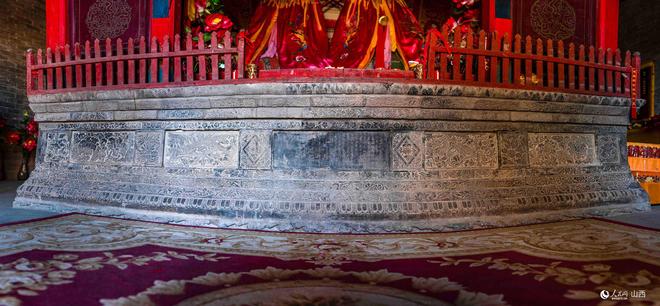 正殿中央现存青石雕须弥座式神台,高约0.8米、边长约3米,其形制与北宋《营造法式》“垒砌须弥坐殿阶基”条目记载完全吻合。束腰处嵌饰牡丹、荷花、莲瓣等浮雕图案,中央镶嵌金大定十二年重修题记碑。